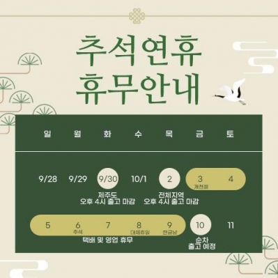 다가오는 추석 연휴 기간의 영업 및 배송 일정을 아래와 같이 안내드립니다.