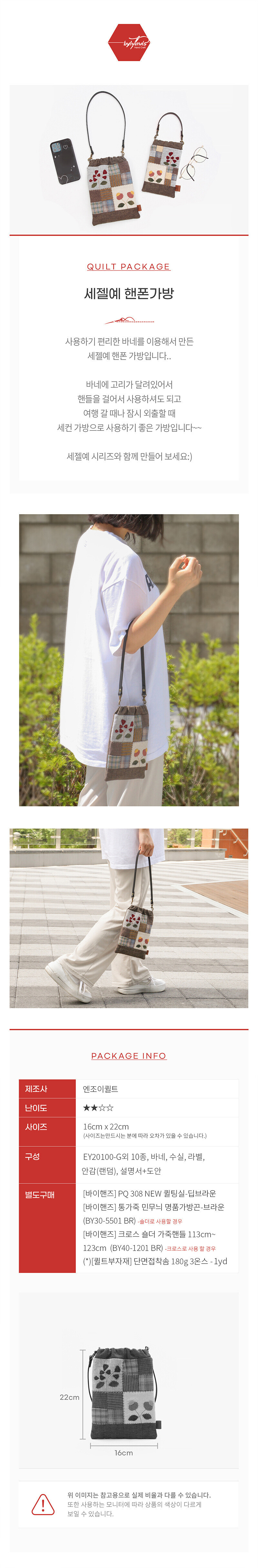 바이핸즈 오리지널 퀼트 패키지 유튜브 영상제공 퀼트패키지 가방 세젤예 핸폰가방.직접 만들어 더 소중한 핸드메이드 가방 만들기 DIY 키트입니다.엔조이퀼트 자체 제작 도안과 고급 수입 원단 사용.난이도 중급, 기초 바느질 가능하신 분 추천.구성품: 실물 도안, 설명서, 원단, 부자재. 솜과 실은 별도 구매.태교 바느질, 직장인 취미, 엄마 선물 추천 아이템.