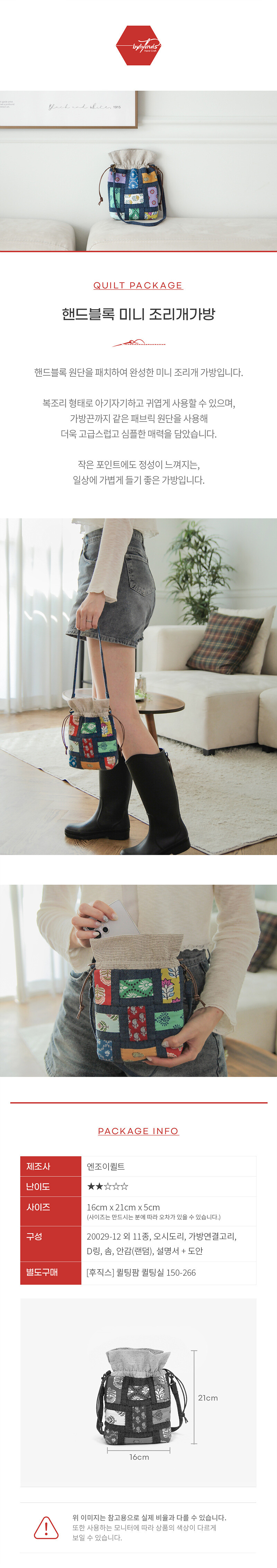 바이핸즈 오리지널 퀼트 패키지 퀼트패키지 가방 핸드블록 미니 조리개가방.직접 만들어 더 소중한 핸드메이드 가방 만들기 DIY 키트입니다.엔조이퀼트 자체 제작 도안과 고급 수입 원단 사용.난이도 중급, 기초 바느질 가능하신 분 추천.구성품: 실물 도안, 설명서, 원단, 부자재. 솜과 실은 별도 구매.태교 바느질, 직장인 취미, 엄마 선물 추천 아이템.