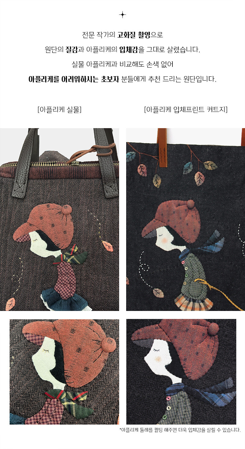 작품을 만들 수 있습니다. 벽걸이,소품,가방,이불 등 완제품 활용도가 아주 높은 원단입니다.