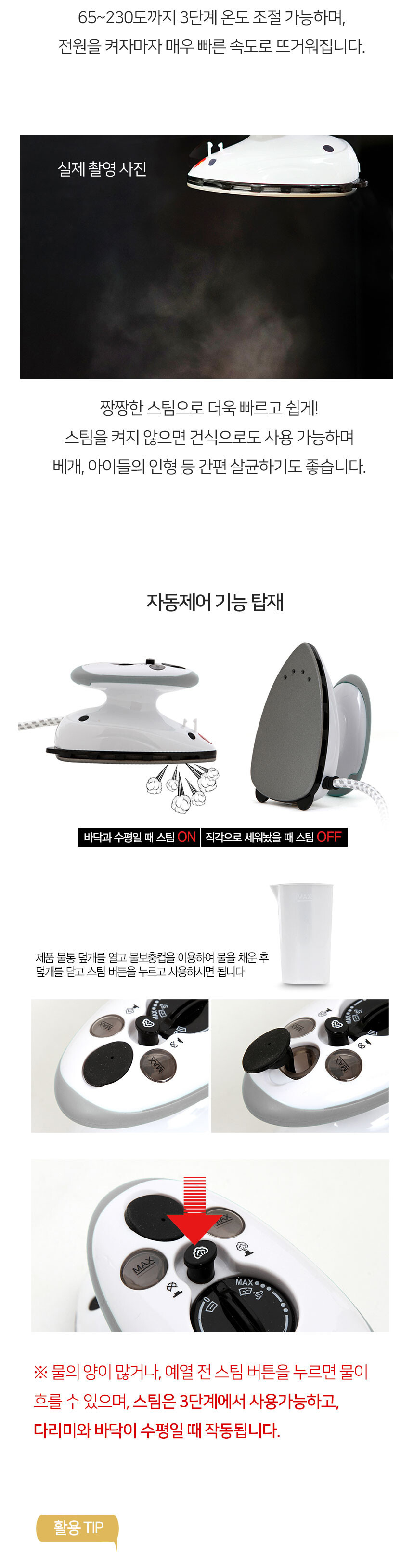 다리미 앞쪽의 빨간불이 꺼지면 예열이 완료된 상태이며, 이때 스팀 버튼을 누르시면 잠시 후 스팀이 분사됩니다.
