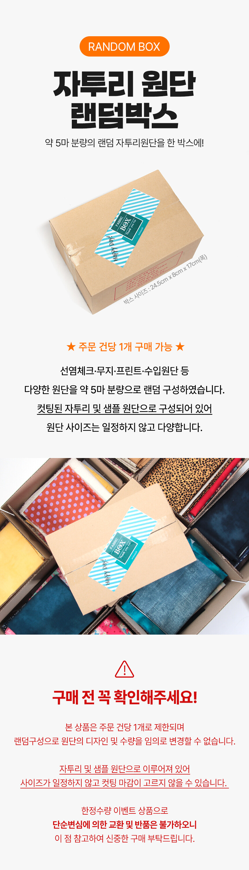 랜덤구성으로 원단의 디자인 및 수량을 임의로 변경할 수 없습니다.
