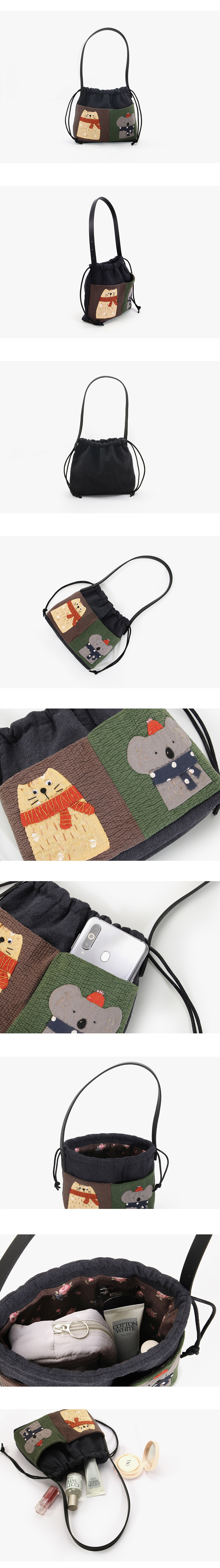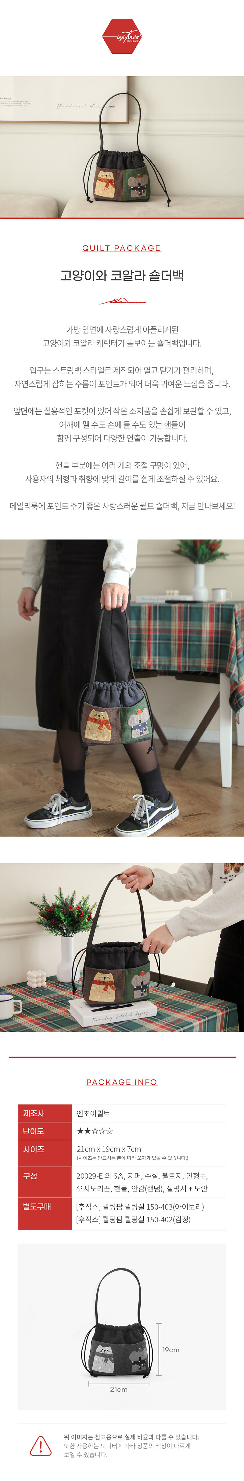 바이핸즈 고양이 코알라 캐릭터 복조리 숄더백 퀼트 가방 DIY 패키지입니다. 가방 앞면에는 사랑스럽게 아플리케된 고양이와 코알라 캐릭터가 나란히 들어가 있어 포근한 분위기를 더해 줍니다. 21cm x 19cm x 7cm 정도의 사이즈로, 데일리 외출용 미니 숄더백이나 소지품 수납용 버킷백으로 활용하기 좋은 퀼트 가방입니다.