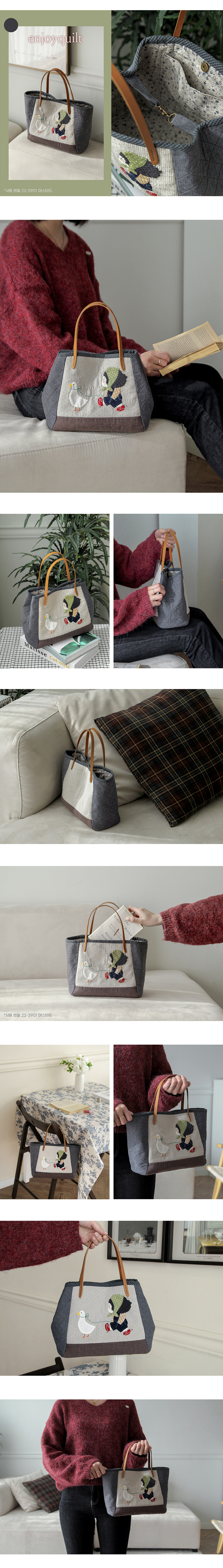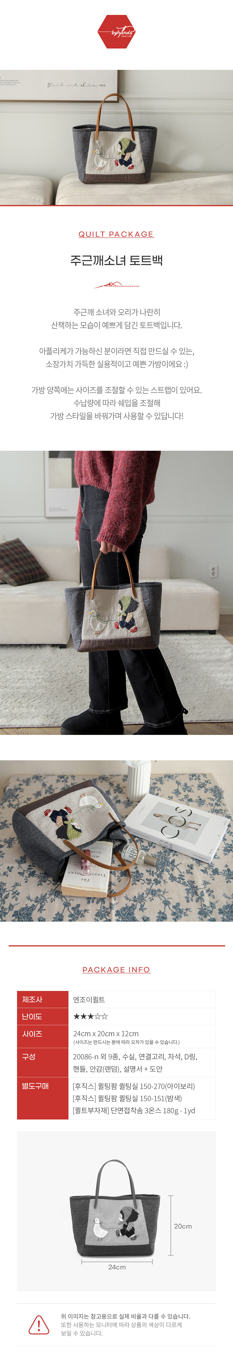 바이핸즈, 엔조이퀼트 퀼트 가방 DIY 패키지입니다. 본 상품은 완제품이 아니라 직접 만들어야 하는 퀼트 패키지이며, 완성 기준 사이즈는 26cm x 17cm x 10cm(약간 오차 가능)로 안내되어 있습니다. 구성품은 케이트 그린어웨이 커트지 외 8종, 수실, 레이스, 면끈, 핸들, 안감(랜덤), 설명서+도안 포함으로 제공됩니다. 아래 상세 이미지를 통해 완성 예시, 사이즈와 구성 안내를 확인하신 후 제작에 참고해 주세요.