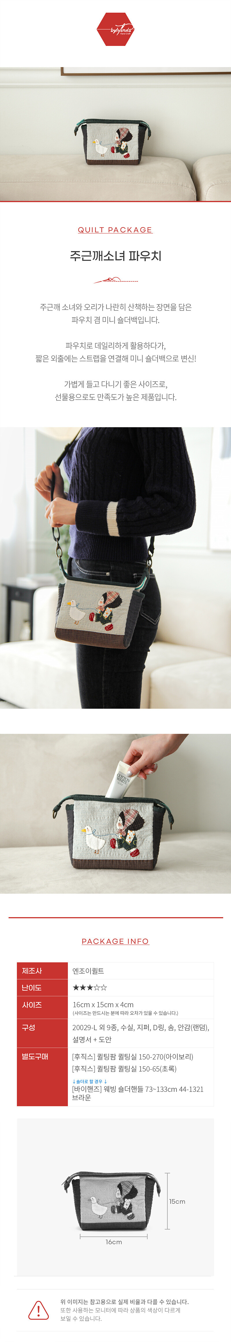 바이핸즈, 엔조이퀼트 퀼트 가방 DIY 패키지입니다. 본 상품은 완제품이 아니라 직접 만들어야 하는 퀼트 패키지이며, 완성 기준 사이즈는 26cm x 17cm x 10cm(약간 오차 가능)로 안내되어 있습니다. 구성품은 케이트 그린어웨이 커트지 외 8종, 수실, 레이스, 면끈, 핸들, 안감(랜덤), 설명서+도안 포함으로 제공됩니다. 아래 상세 이미지를 통해 완성 예시, 사이즈와 구성 안내를 확인하신 후 제작에 참고해 주세요.