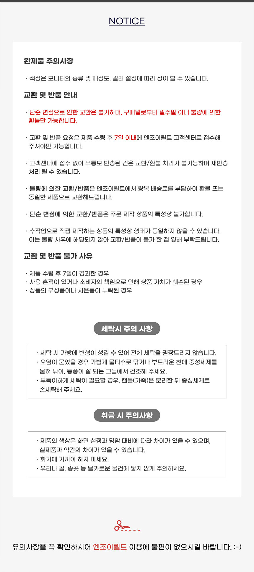 - 단순 변심으로 인한 교환은 불가하며, 구매일로부터 일주일 이내 불량에 의한 환불만 가능합니다.